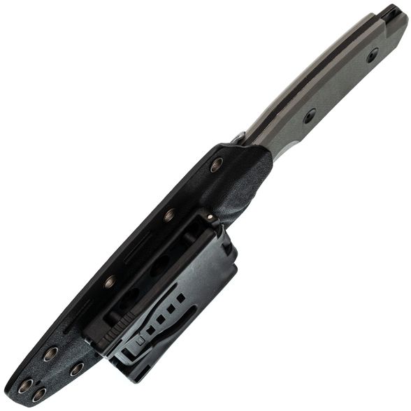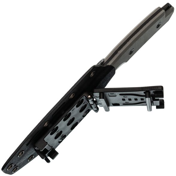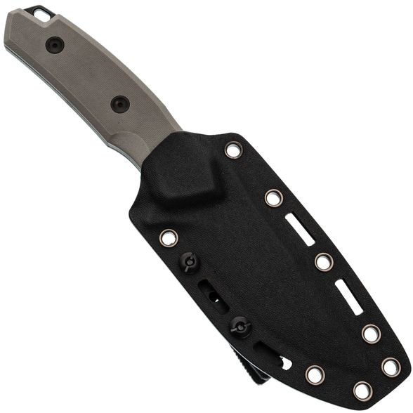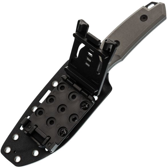 3. Ножны: Созданы из кайдекса – прочного термопластика, который формируется под контуры ножа, обеспечивая его надёжную фиксацию в любом положении. Благодаря люверсам и прорезям, нож можно легко крепить к снаряжению, а комплект поставки с креплением Tek Lok позволяет носить его горизонтально или вертикально на ремне.