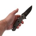 1. Клинок: Изготовлен из высококачественной стали AUS-8, которая долго сохраняет остроту и отлично сопротивляется коррозии, что делает её одной из лучших в среднем ценовом сегменте. Покрытие Black Stonewash придаёт клинку матовый вид, предотвращая блики и ржавление, а профиль Drop-Point с прямыми высокими спусками обеспечивает превосходное резание для решения самых разнообразных задач.