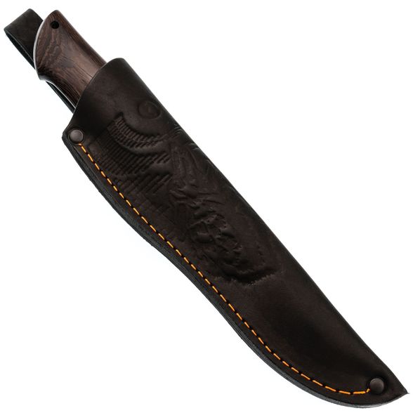 Рукоять ножа Бладхаунт изготовлена из прочной древесины венге, которая обеспечивает идеальный баланс между прочностью и весом. Изогнутая форма рукояти повторяет контуры ладони, обеспечивая комфортный и безопасный хват. Бочковитость рукояти заполняет руку, позволяя длительное время работать с ножом без дискомфорта.