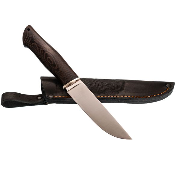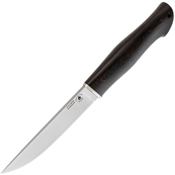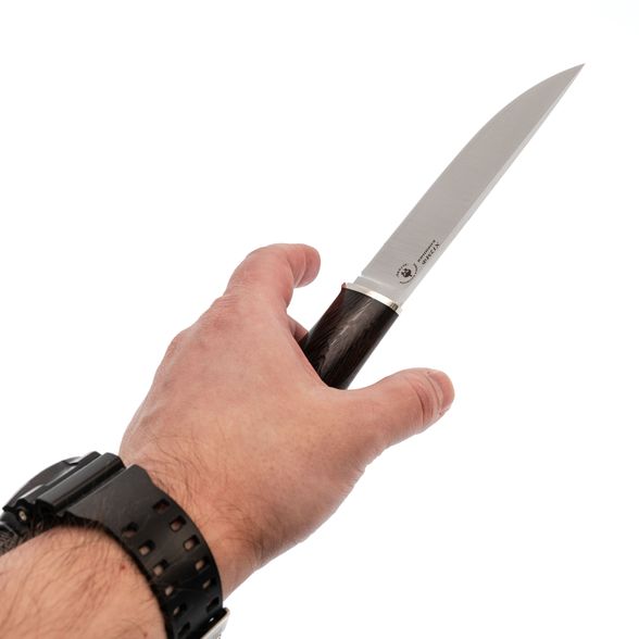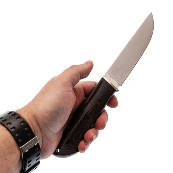 Клинок ножа изготовлен из высококачественной инструментальной стали Х12МФ, которая по своим свойствам аналогична стали D2. Такая сталь обеспечивает длительное сохранение заточки и агрессивный рез, что делает нож идеальным для различных задач. Форма клинка - универсальный Drop-Point, признанный одним из лучших по совокупности характеристик. Прямые спуски от обуха обеспечивают плавный и чистый рез, позволяя справляться с любыми материалами.