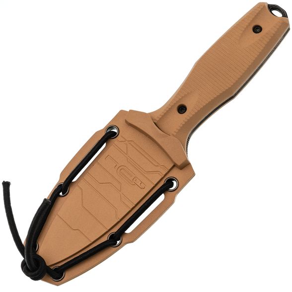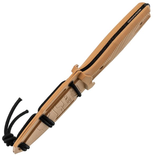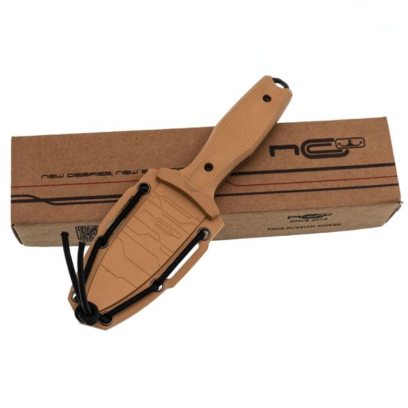 Корпус ножен выполнен из легкого, но прочного пластика, что обеспечивает им устойчивость к механическим повреждениям при минимальном весе. В комплекте идёт шок-корд, дающий возможность закрепления ножа на ремне, разгрузке или лямке рюкзака, обеспечивая удобство и быстроту доступа в различных условиях эксплуатации.