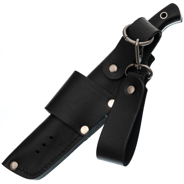 Ножны изготовлены из натуральной кожи с погружной конструкцией, которая надежно удерживает нож, предотвращая его выпадение. Они оснащены жестким и свободным подвесом, а также горизонтальным креплением, что позволяет удобно носить нож в любых условиях.