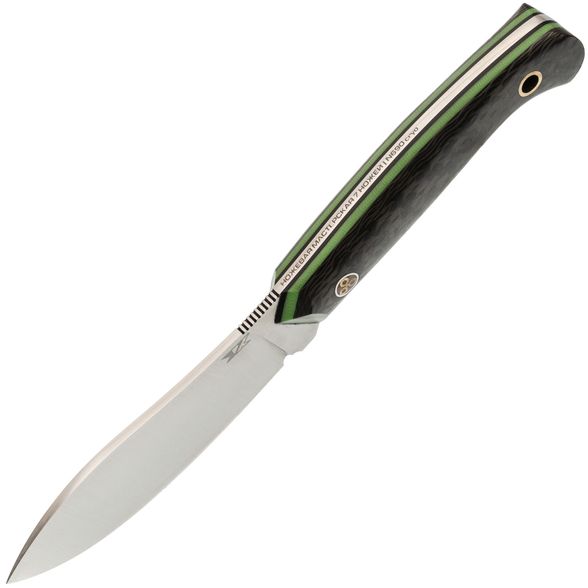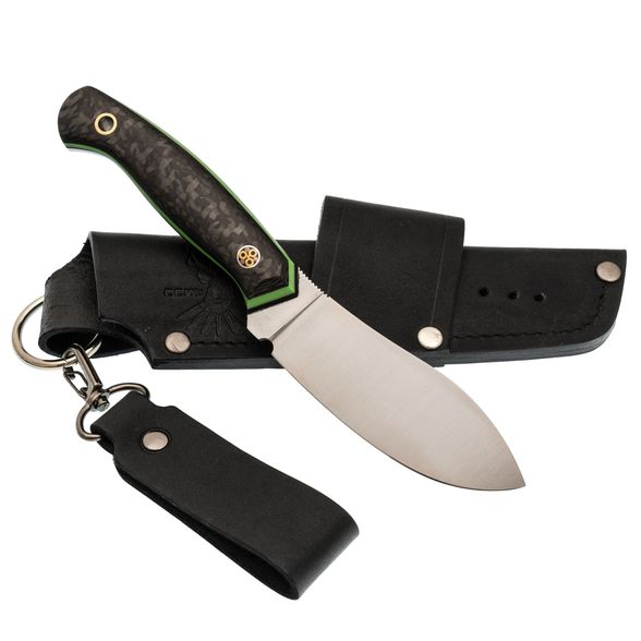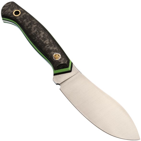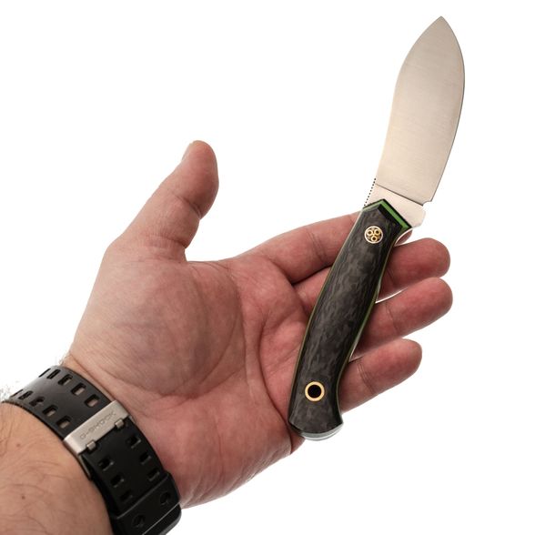 Рукоять имеет эргономичный дизайн с удобным изгибом. Она изготовлена с использованием накладного монтажа, при котором накладки из стеклотекстолита G10 и карбона обеспечивают прочность и привлекательный внешний вид. Рукоять хорошо заполняет руку, что позволяет комфортно и уверенно держать нож в течение длительного времени без возникновения дискомфорта.