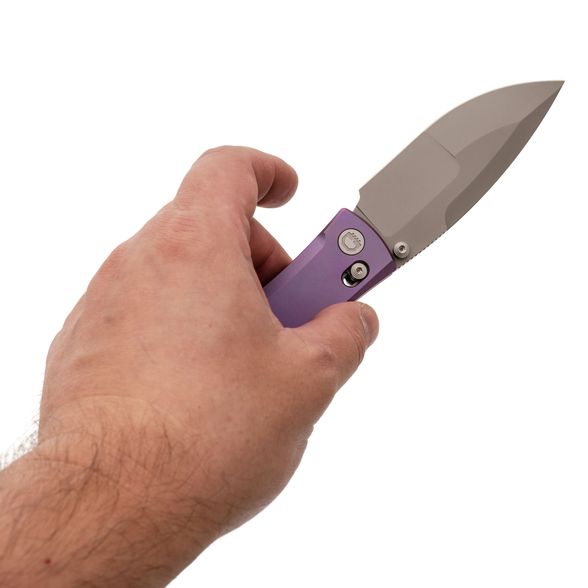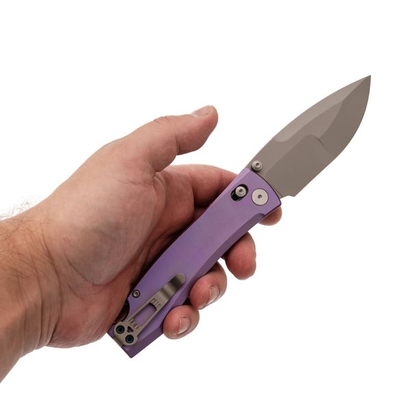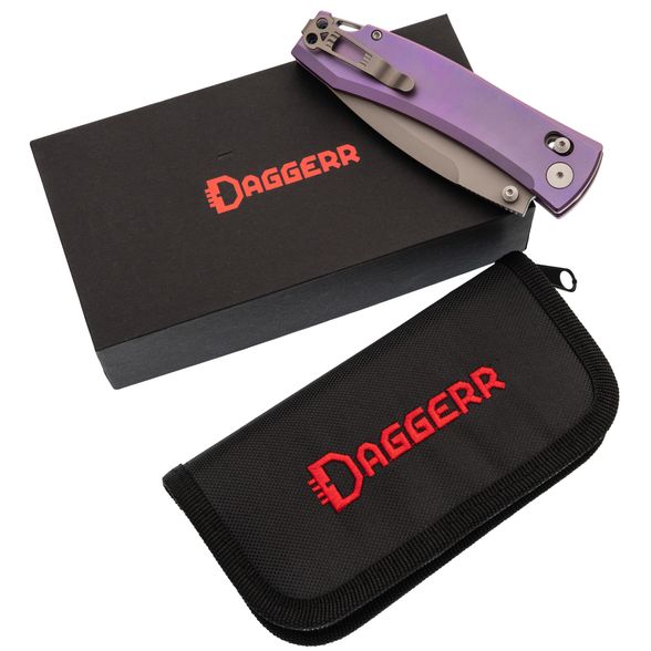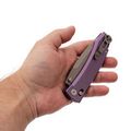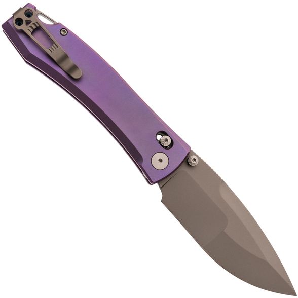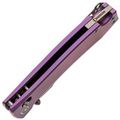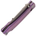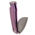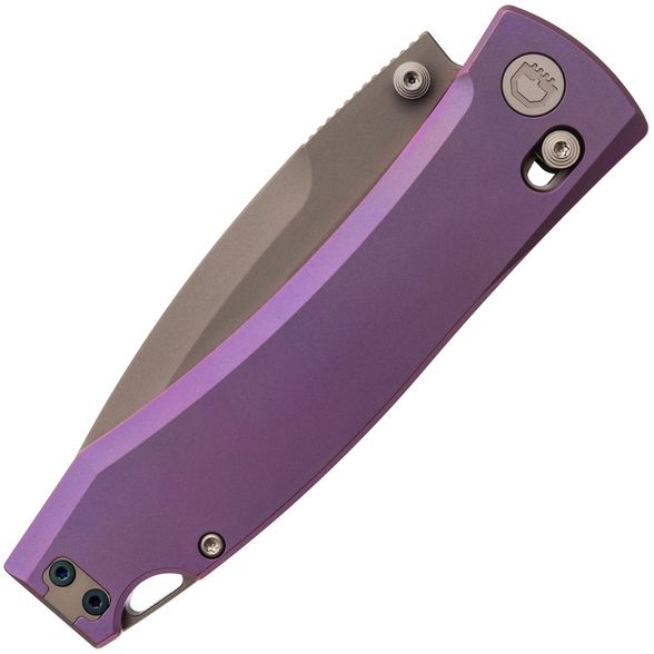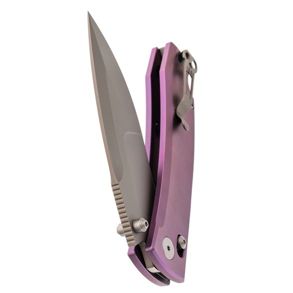 Рукоять, выполненная из титановых половинок, обеспечивает идеальный баланс между прочностью и легкостью. Нежный фиолетовый цвет рукояти создает интересный контраст с агрессивным клинком, придавая ножу уникальный стиль. Замок, аналогичный известному Axis-Lock, обеспечивает безопасное и удобное складывание ножа, не требуя подставлять пальцы под клинок. Кроме того, этот механизм позволяет инерционно открывать нож одним движением.