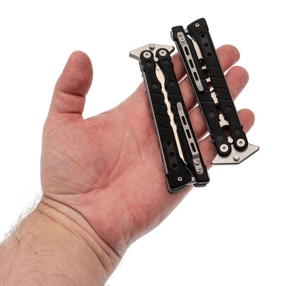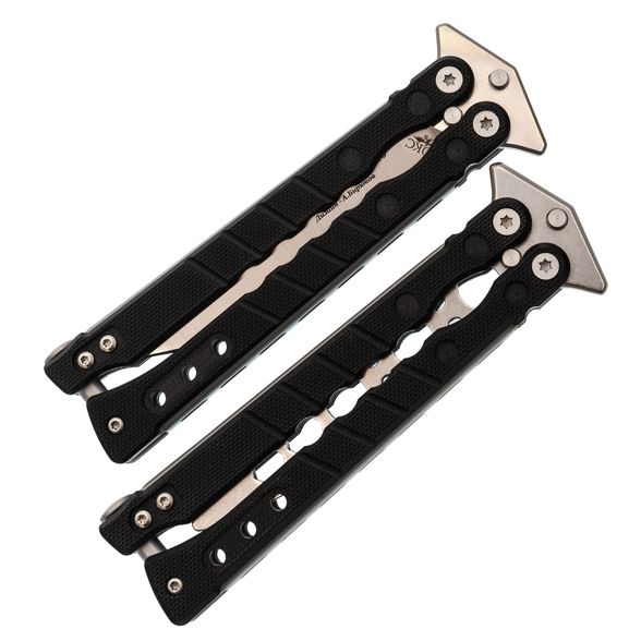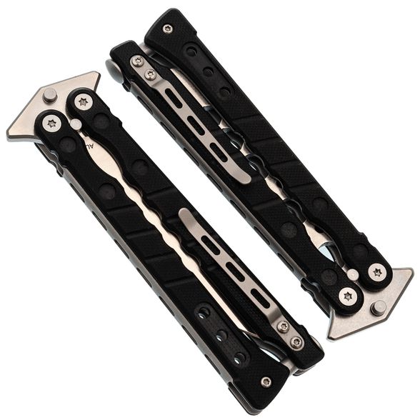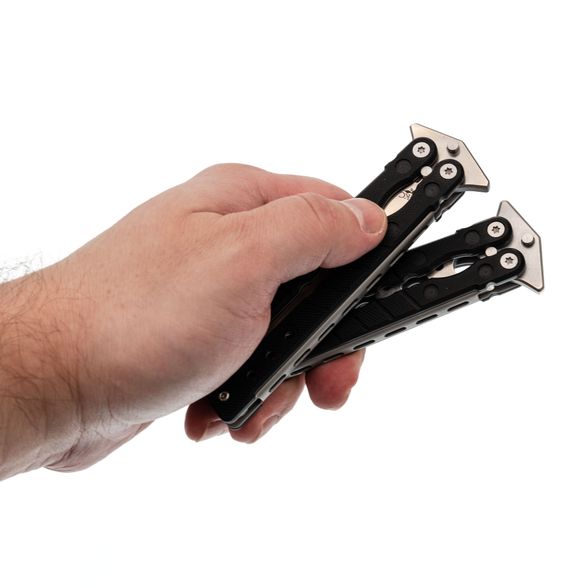 Рукоять ножа, как и в других моделях бабочек, состоит из двух половинок, выполненных из стеклотекстолита G10 – материала, известного своей прочностью, лёгкостью и устойчивостью к экстремальным условиям. Цепкая текстура на рукоятках обеспечивает уверенный захват, а латч блокирует рукояти в закрытом или открытом положении для максимальной безопасности. Для удобства повседневного ношения предусмотрена надёжная клипса.