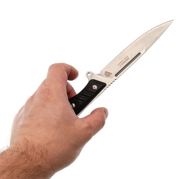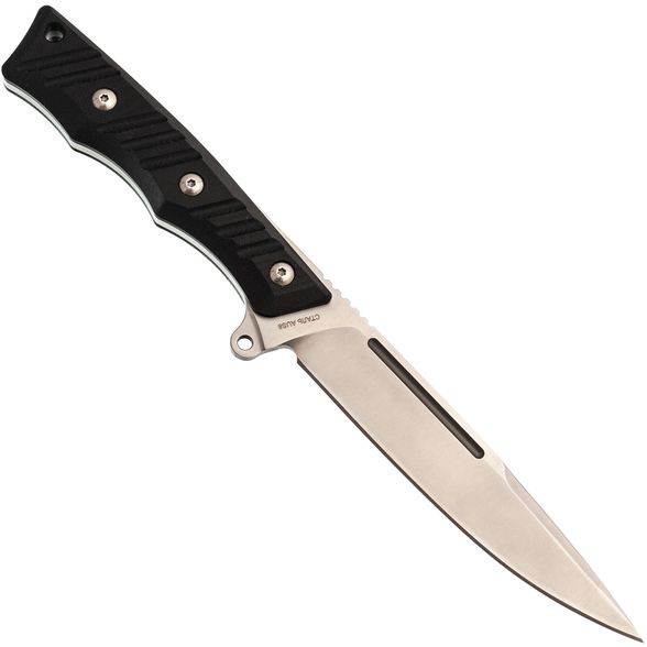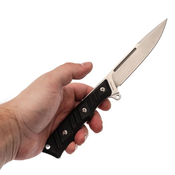 Рукоять выполнена в цельнометаллическом варианте с накладным монтажом, что гарантирует прочность и надежность. Накладки из стеклотекстолита G10 обеспечивают отличное сцепление с рукой и устойчивость к воздействию окружающей среды. Эргономичная форма рукояти и подпальцевый упор позволяют комфортно и безопасно удерживать нож в различных хватах.