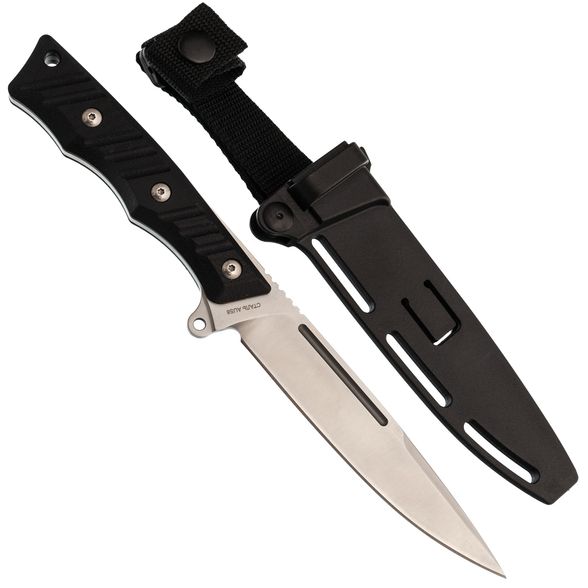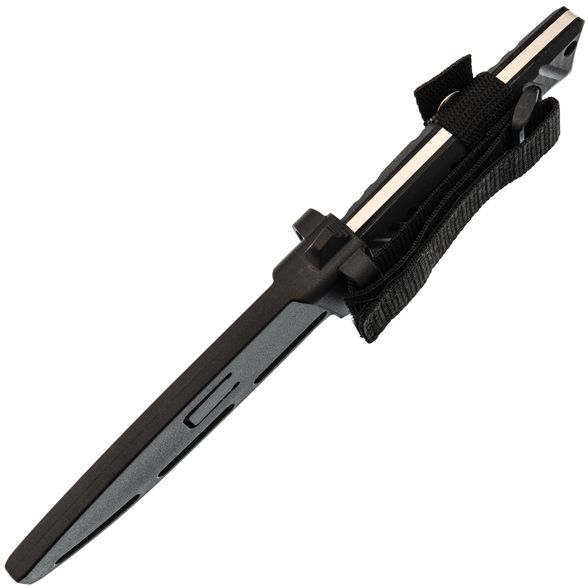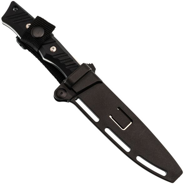 Ножны изготовлены из прочного пластика, что гарантирует их долговечность и легкость в уходе. Они надежно фиксируют нож и обеспечивают его сохранность. Дизайн ножен предусматривает наличие прорезей и люверсов, позволяющих удобно закрепить нож на снаряжении в соответствии с индивидуальными предпочтениями пользователя.