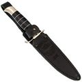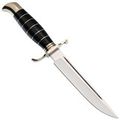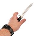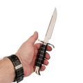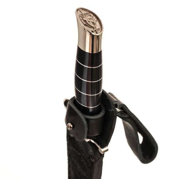 Рукоять финок НКВД представляет собой изысканное сочетание функциональности и эстетики. Её S-образная гарда обеспечивает высокую степень защиты в использовании, а грибок-навершие придает особую изящность. Изготовленные из мельхиора, эти элементы не только выглядят благородно, но и обладают повышенной стойкостью к коррозии и другим агрессивным воздействиям. Сама рукоять бочковитой формы выполнена из акрила с проставками, что придает ей благородный внешний вид. Акрил - надежный и неприхотливый материал, который обеспечивает долговечность изделия. В отличие от дерева, акрил не подвержен воздействию влаги и температурных изменений, что делает его более практичным для использования. Барельефные элементы на рукояти добавляют эстетический шарм и усиливают комфорт при работе с инструментом.