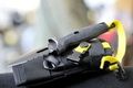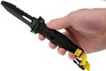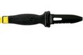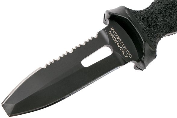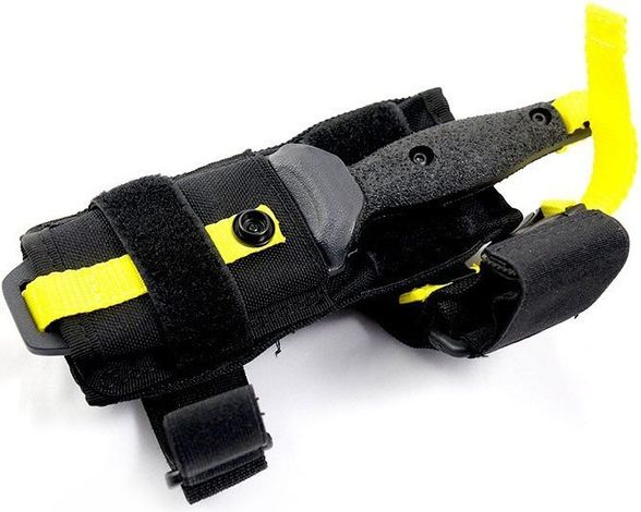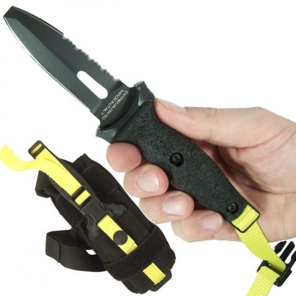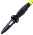 Нож ныряльщика Dicok Diving Compact, клинокчерный с отверстием, 2/3 серрейтор, рукоять черный пластик, чехол черный кордура/нейлон, оснащен ременной системой для крепления ножа на бедре или предплечье, страховочный ремешок яркого желтого цвета.