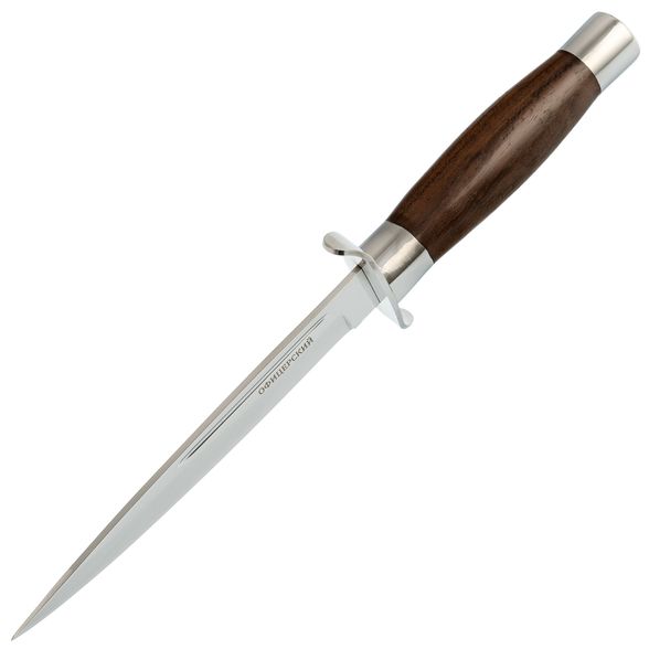 Нож разведчика Офицерский - это гражданская версия военного ножа, разработанная и произведенная компанией Pirat. Визуально нож напоминает клинки времен Великой Отечественной Войны, но при этом не является холодным оружием из-за обуха толщиной 2,4 мм.