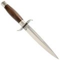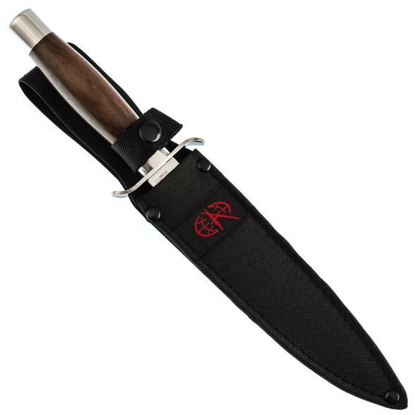 Рукоять ножа имеет бочковидную форму и изготовлена из полированного дерева венге. Она надежно закреплена на клинок с помощью всадного монтажа и удобно лежит в руке. Развитая гарда рукояти обеспечивает дополнительную надежность и безопасность при использовании.