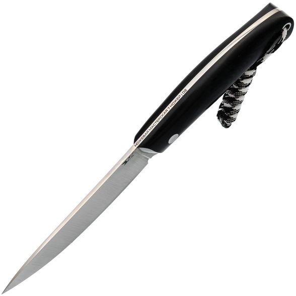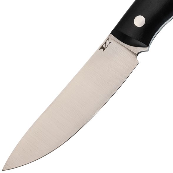 Клинок ножа изготовлен из инструментальной стали D2, известной своим исключительным удержанием остроты. Это делает её превосходным выбором для охотничьих ножей, так как нож не требует заточки в процессе длительных работ, например, при разделке. Форма клинка – Skinner, что обеспечивает широкий изгиб и удлинённую режущую кромку, упрощающую процесс ошкуривания. Прямые спуски от обуха улучшают режущие характеристики, позволяя легко справляться с различными материалами. Ножи мастерской проходят ручную заточку, благодаря чему клинок сразу готов к эффективному использованию.