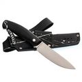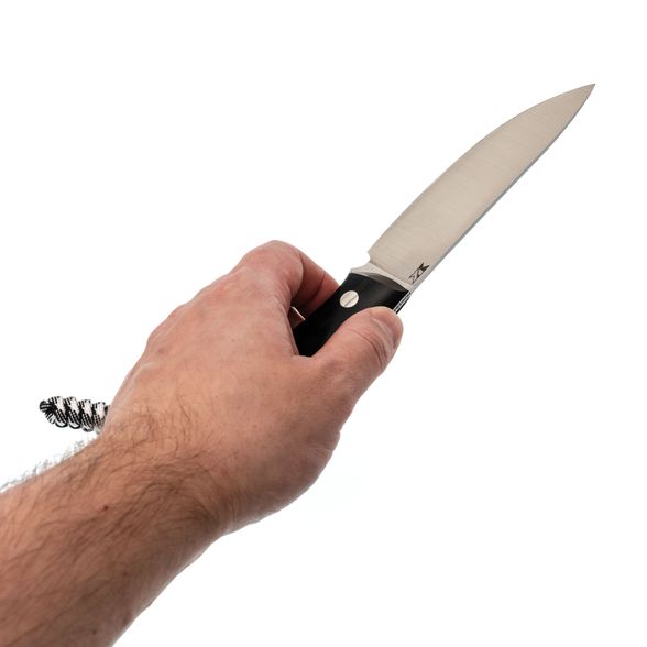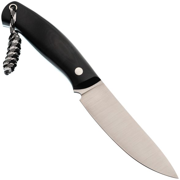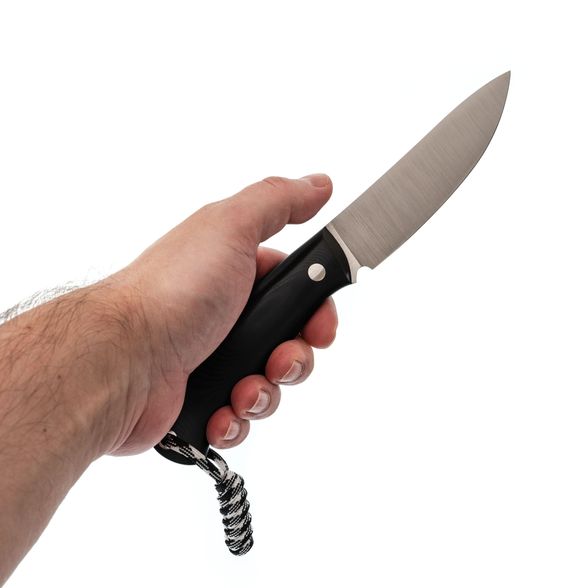 Рукоять выполнена из стеклотекстолита G10, обладающего высокой прочностью и устойчивостью к износу. Это делает нож неприхотливым в уходе. Форма рукояти изогнутая и эргономичная, что позволяет комфортно пользоваться ножом даже при длительных нагрузках. Конструкция рукояти цельнометаллическая, обеспечивая надежность и долговечность. Для удобства также предусмотрено отверстие для темляка.
