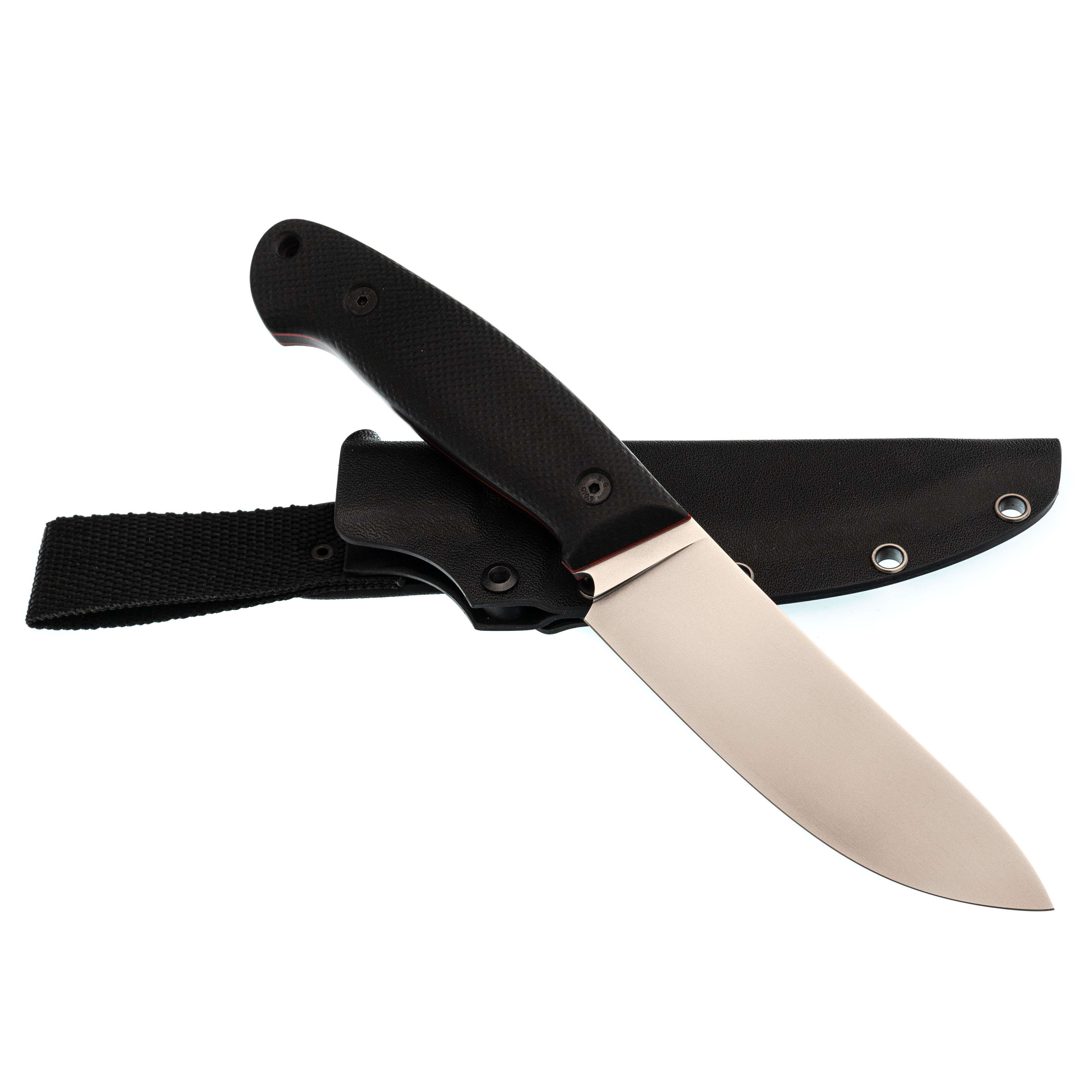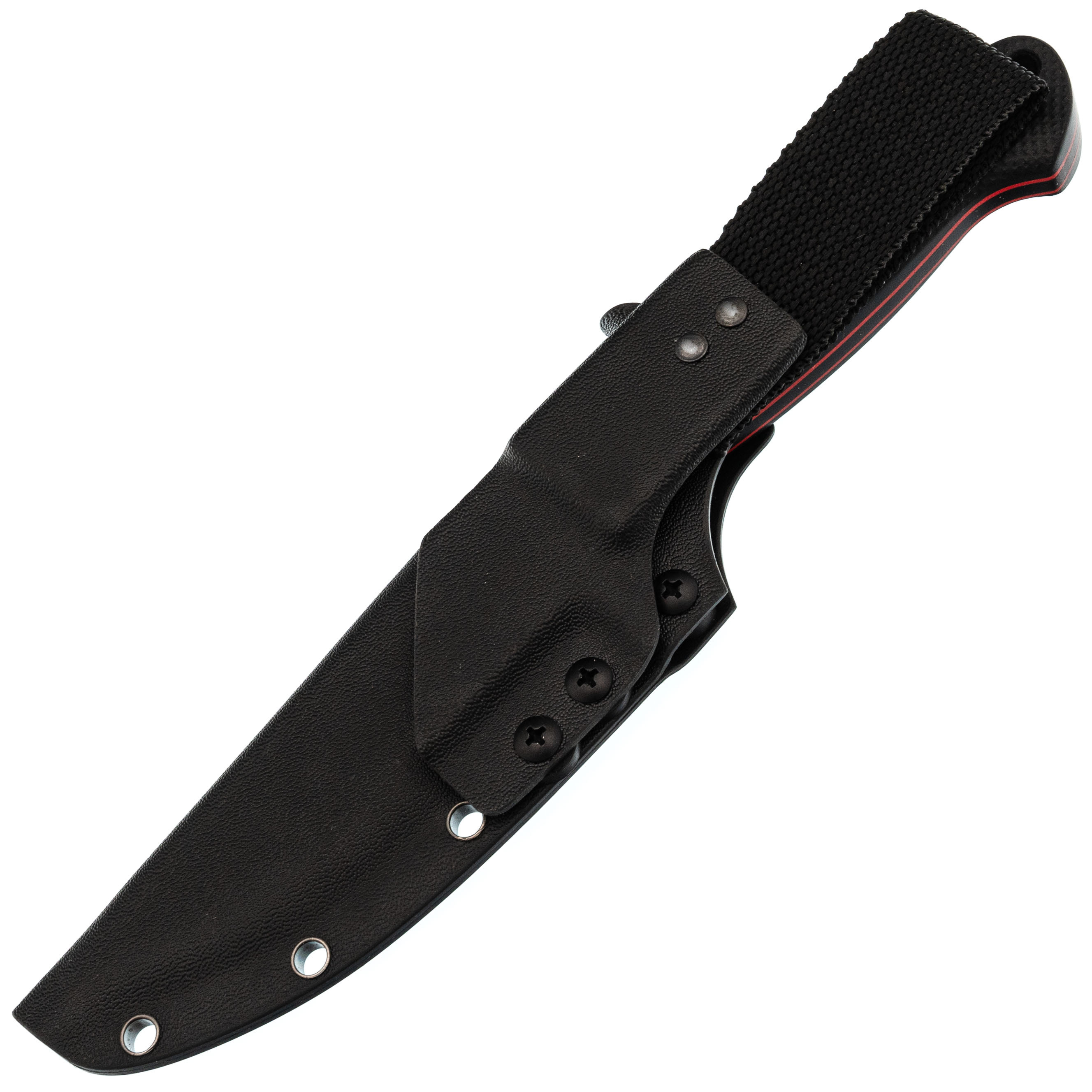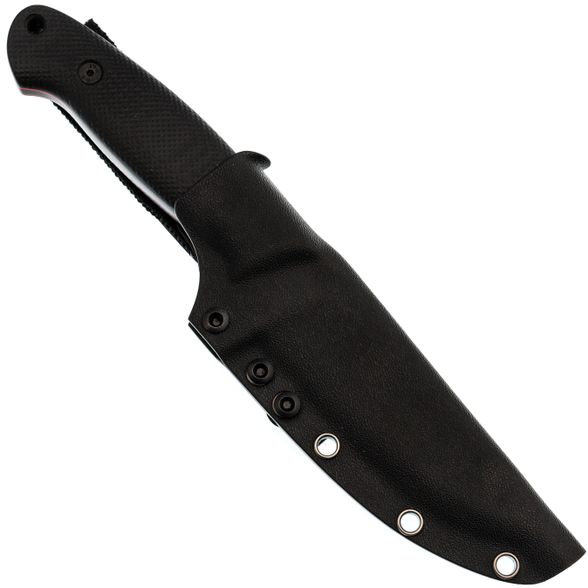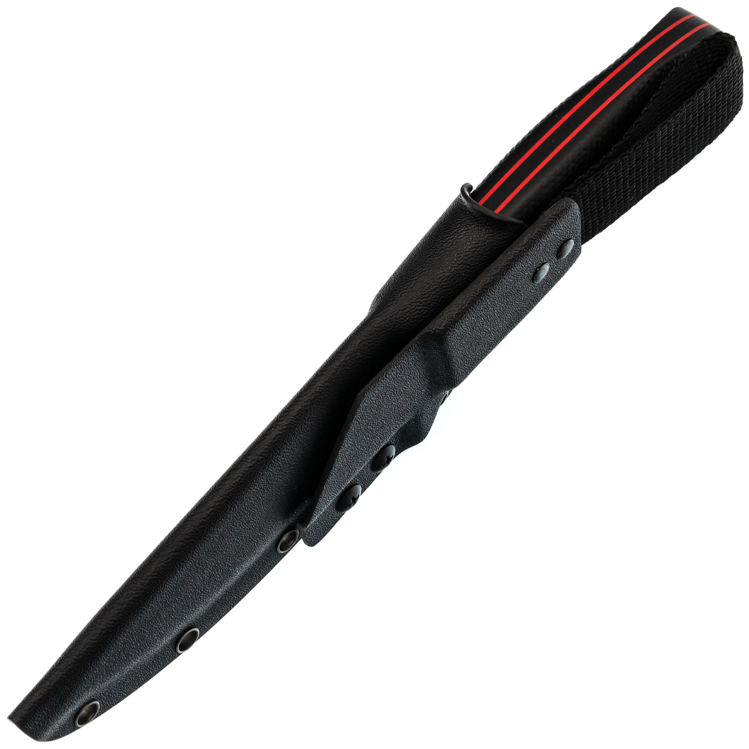 Ножны выполнены из Kydex, что делает их прочными, жёсткими и устойчивыми к внешним воздействиям. Форма плотно фиксирует клинок, а жёсткий подвес на нейлоновую стропу позволяет надёжно носить изделие на ремне, не ограничивая свободу движений.