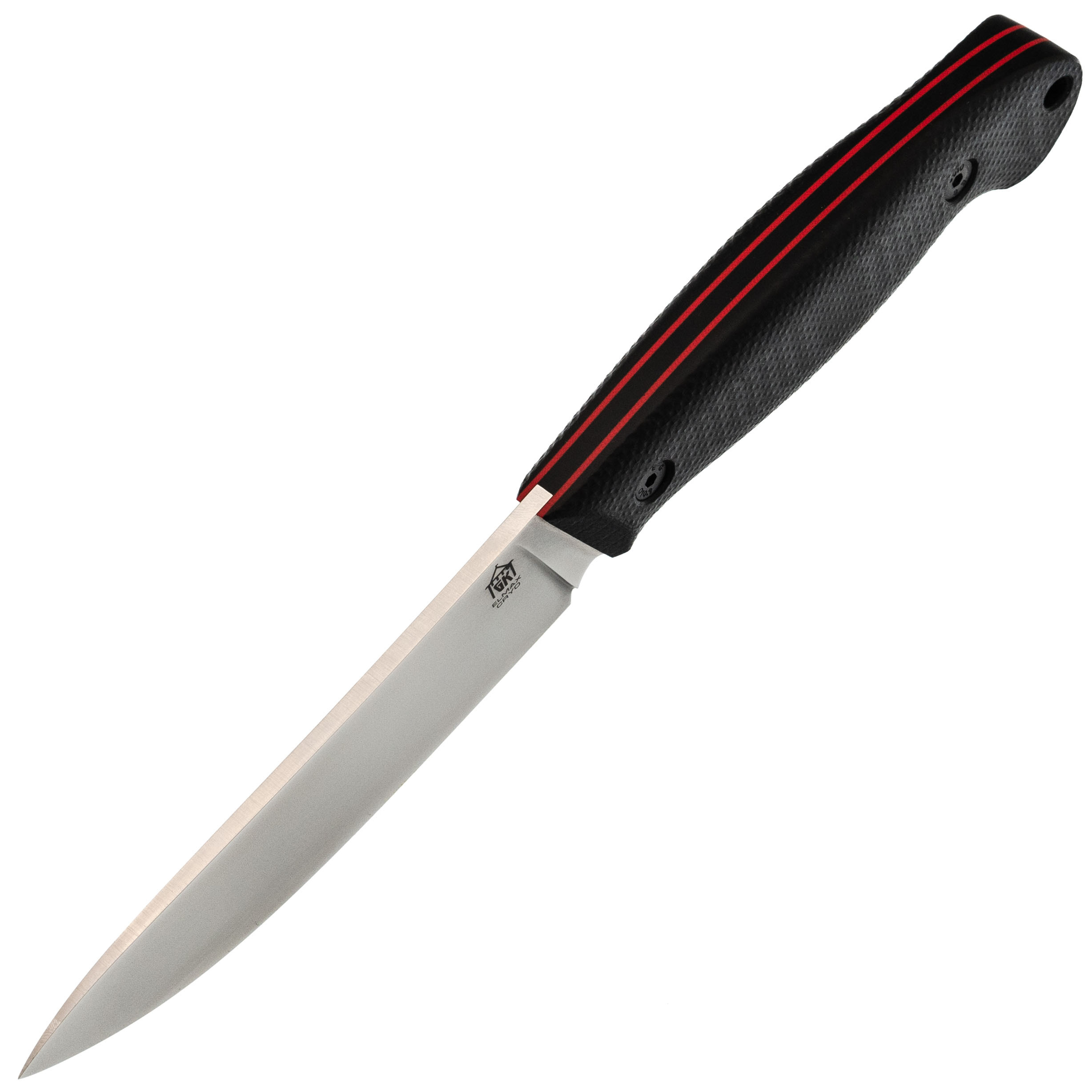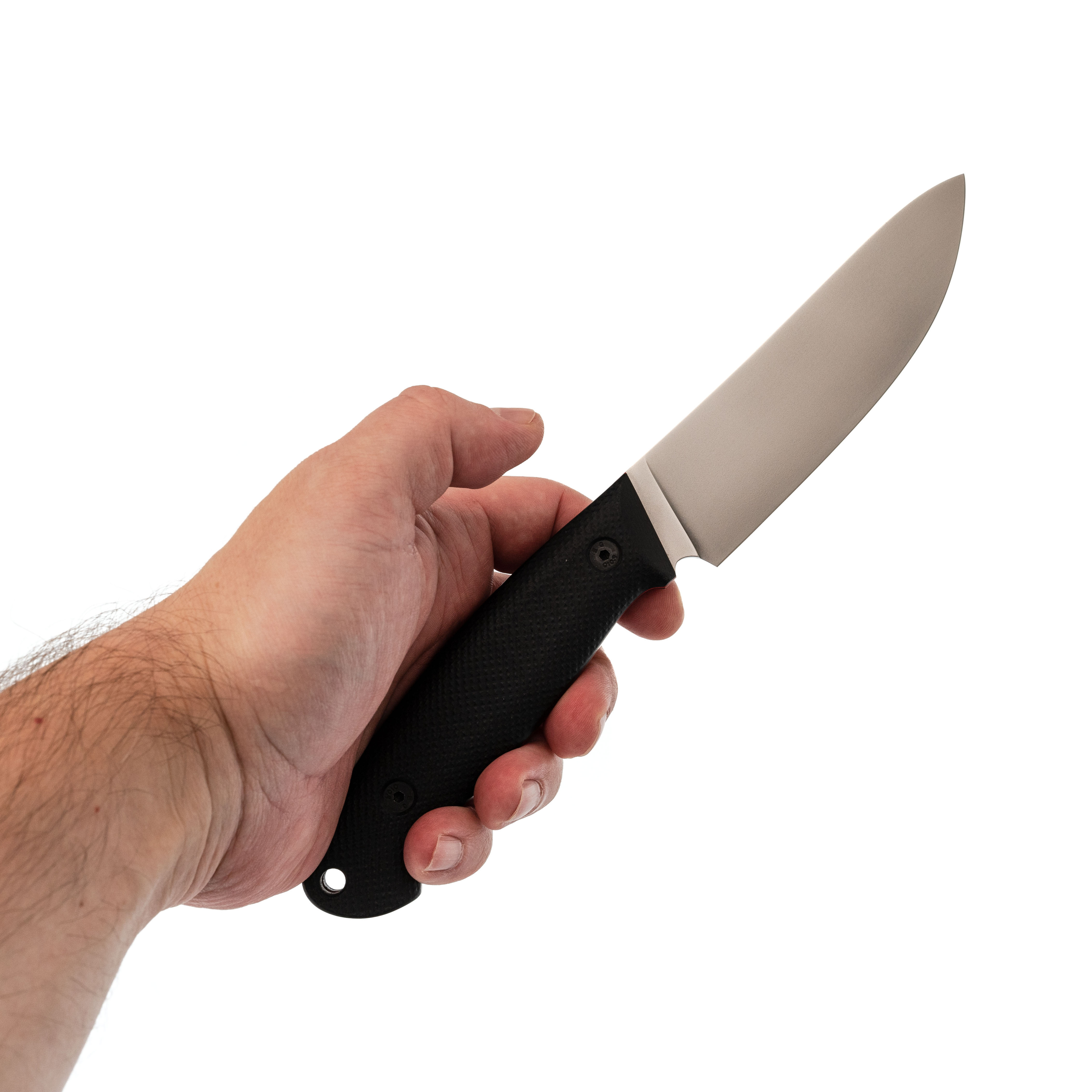 Монтаж скрытый Full-Tang делает конструкцию цельной и прочной: внутри рукояти проходит полноценный металлический стержень, скрытый под накладками из G10. Материал остаётся лёгким, но крепким, а цепкая насечка обеспечивает уверенный хват даже в перчатках или влажных условиях. Рукоять удобно ложится в ладонь, снижая усталость при длительной работе.