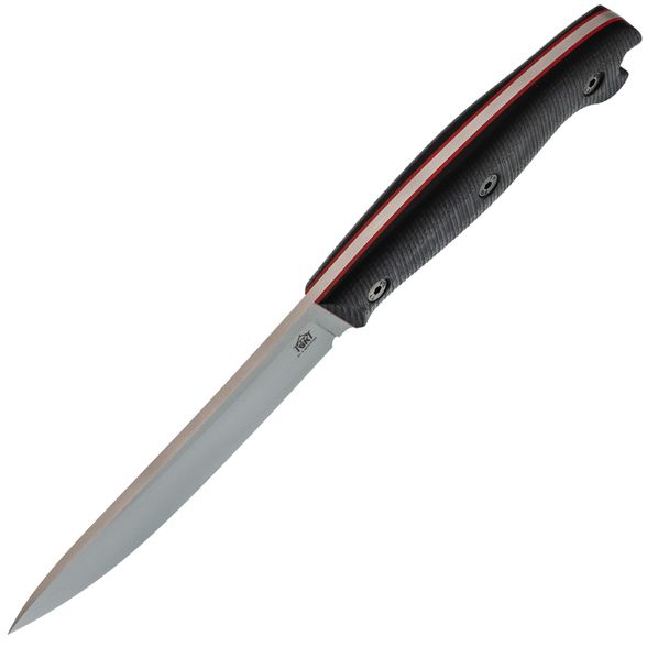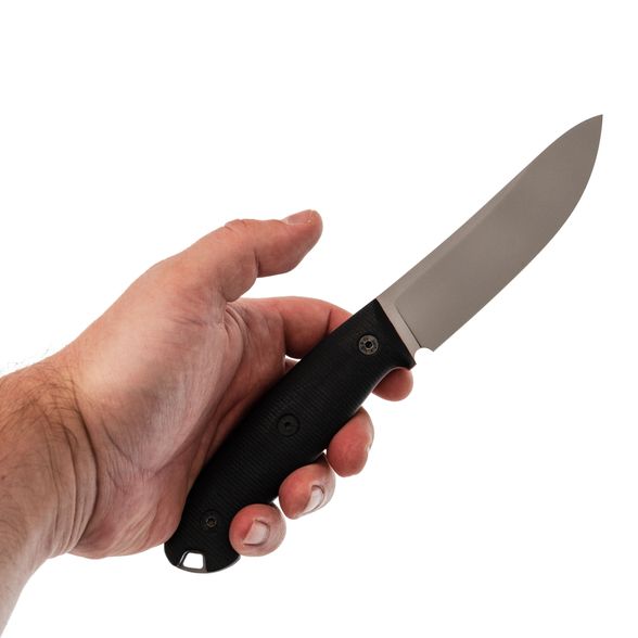 Рукоять изготовлена из G10 — прочного композитного материала, устойчивого к влаге, перепадам температур и агрессивным воздействиям. Эргономичная, изогнутая форма надежно фиксируется в ладони, а мелкая фрезеровка накладок препятствует скольжению даже в мокрой руке. Цельнометаллический монтаж усиливает конструкцию и повышает общую надежность ножа. Для дополнительного удобства предусмотрено темлячное отверстие.