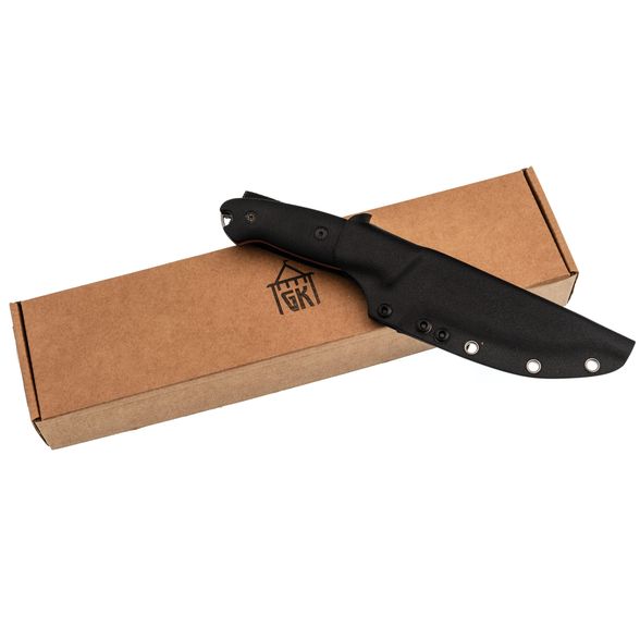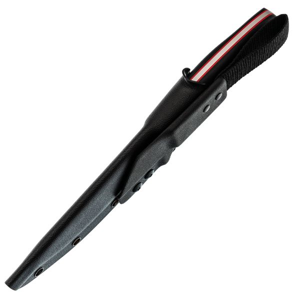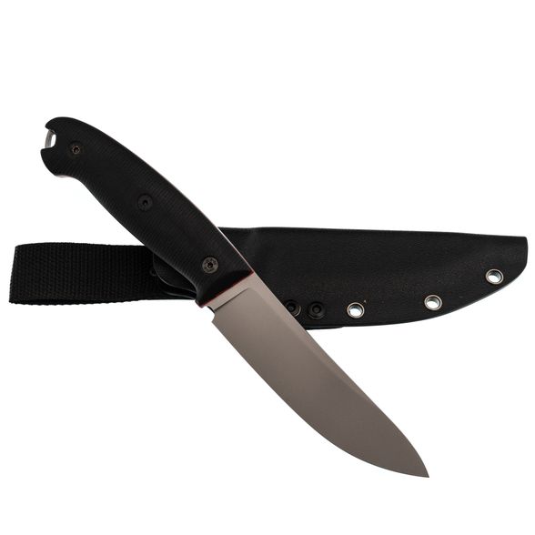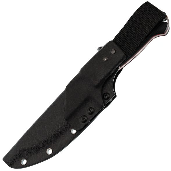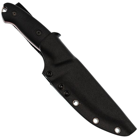 Нож комплектуется ножнами из кайдекса — они лёгкие, прочные и не требуют ухода. Благодаря точной формовке, нож плотно фиксируется внутри и не выпадает даже при ношении рукоятью вниз. В комплект входит полусвободный подвес, позволяющий носить нож с максимальным комфортом, адаптируя его под различные стили экипировки.