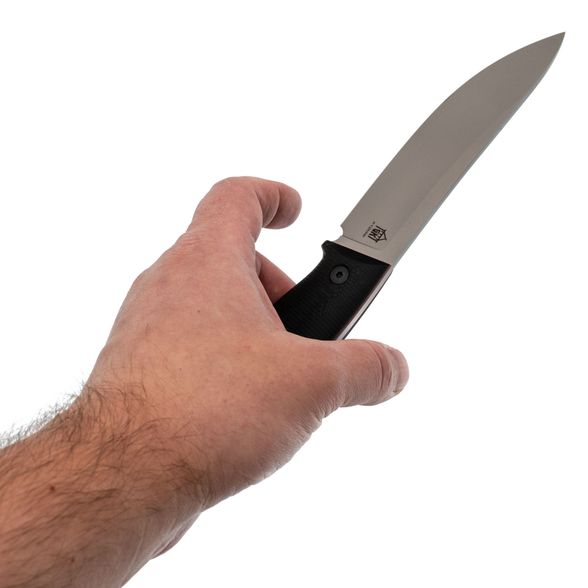 Клинок изготовлен из высококачественной российской стали Х12МФ, которая обеспечивает отличную остроту и долговечность. Эта сталь имеет высокую твердость (61-62 HRC), что позволяет ножу сохранять остроту на протяжении длительного времени, даже при интенсивном использовании. Форма клинка типа Skinner с изогнутой режущей кромкой идеально подходит для ошкуривания, а прямые спуски обеспечивают эффективное и точное резание.