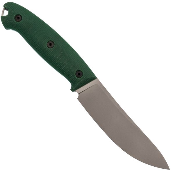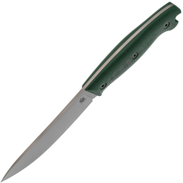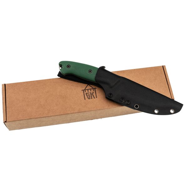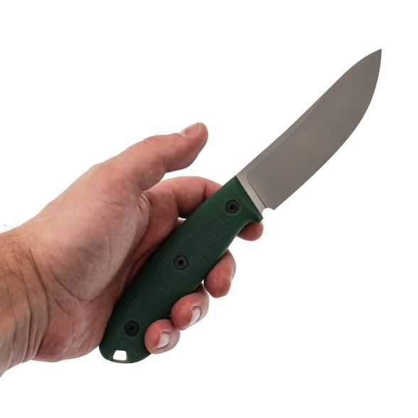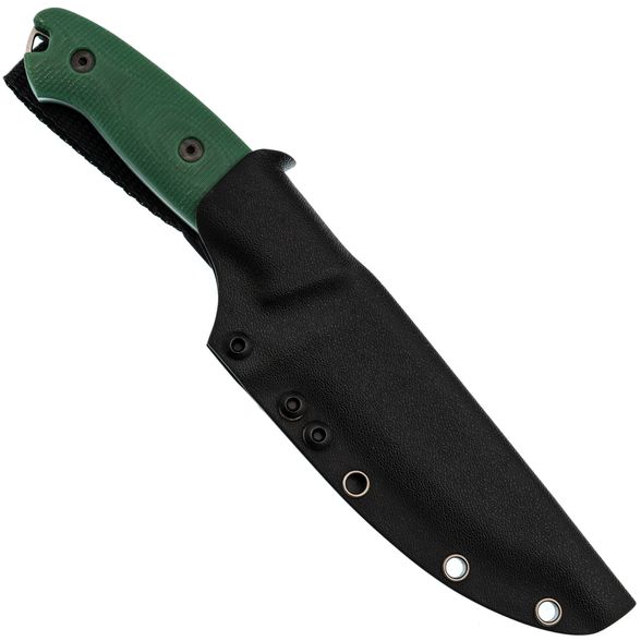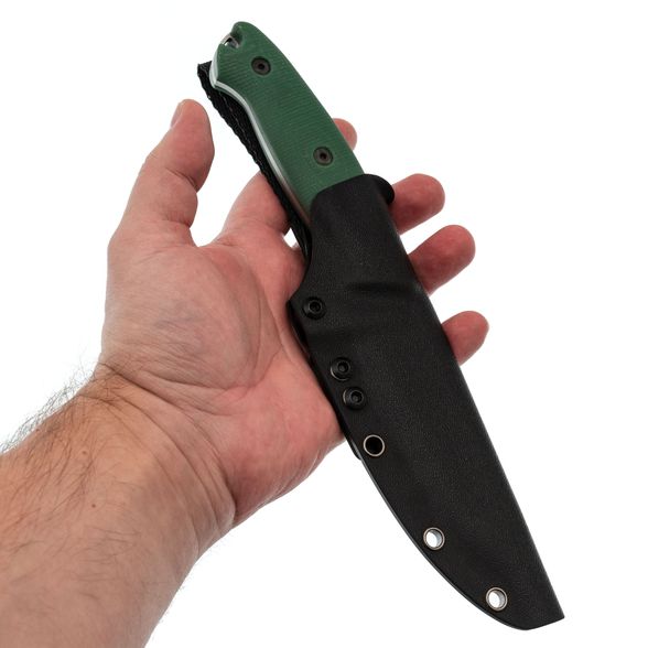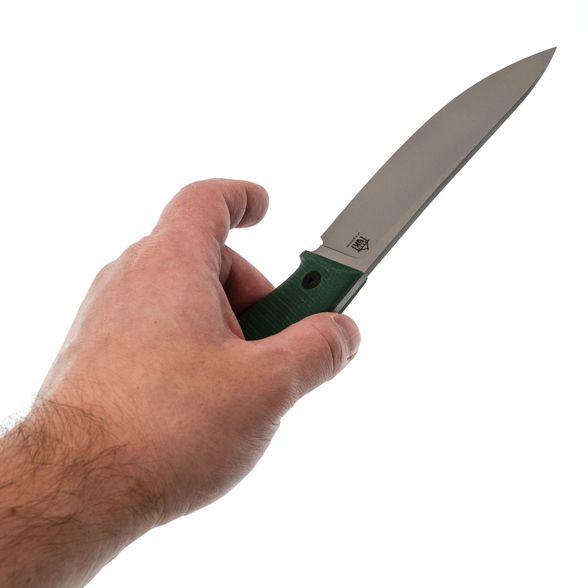 Рукоять - это не просто элемент ножа, а ключ к комфорту и контролю. Она изготовлена из микарты - прочного полимерного материала с бархатистой текстурой, который обеспечивает уникальные тактильные ощущения. Микарта имеет свойство становиться теплой на ощупь и более цепкой при контакте с водой, что особенно ценно в условиях охоты. Со временем рукоять приобретает уникальный, слегка потертый вид, свидетельствующий о долгой и плодотворной службе ножа. Эргономичная форма рукояти идеально подходит для длительной работы, позволяя пальцам естественно обхватывать нож и обеспечивая надежный хват.