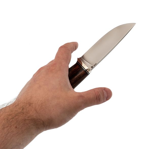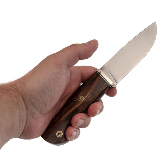Благодаря изогнутой форме рукоять надёжно фиксируется в ладони. Айронвуд не только радует глаз, но и обеспечивает отличный хват даже при влажных руках. Рукоять практична, долговечна и придаёт ножу особый, благородный внешний вид.