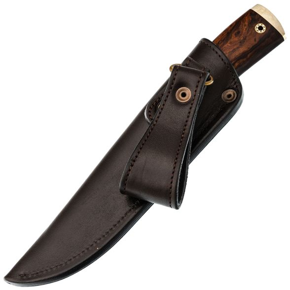 Форма рукояти повторяет анатомию ладони, что особенно важно при длительной работе. Айронвуд не только красив, но и практичен: древесина устойчива к влаге, не скользит, хорошо ощущается в руке даже в перчатках. Темлячное отверстие удобно использовать для крепления страховочного шнура.