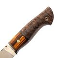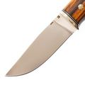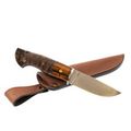 НОЖ ОХОТНИК, СТАЛЬ M390, РУКОЯТЬ КАРЕЛЬСКАЯ БЕРЕЗА, ВСТАВКА ЖЕЛЕЗНОЕ ДЕРЕВО является отличным примером, который наглядно демонстрирует правдивость поговорки «Мал, да удал». Этот нож станет отличным дополнением к вашему набору постоянного туристического или охотничьего снаряжения. Главным элементом этой модели несомненно является клинок из премиальной порошковой стали M390. Этот сплав на данный момент считается одним из лучших для создания полевых и универсальных ножей, за счет долгого удержания заточки, высокой коррозионной стойкости и агрессивному резу. Благодаря классической геометрии с прямыми спусками от обуха, нож обладает плавным и хорошо контролируемым резом. С помощью такого ножа можно с легкостью ошкурить крупного зверя, подготовить мясо для шашлыка и барбекю. Для ценителей внешней стилистики также есть приятный момент — рукоять ножа выполнена из натуральной древесины двух типов и дополнена мельхиоровыми вставками и декоративны пином. Форма у рукояти изогнутая, так что нож хорошо ложится в руку, а объёмность рукояти позволит долго работать ножом без ощутимого дискомфорта.