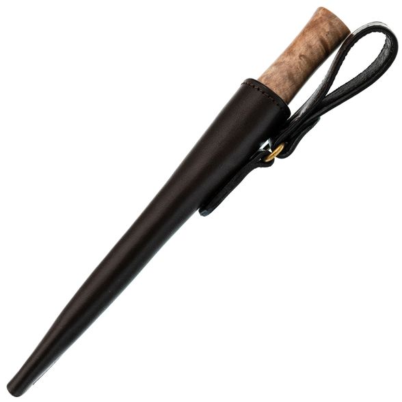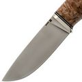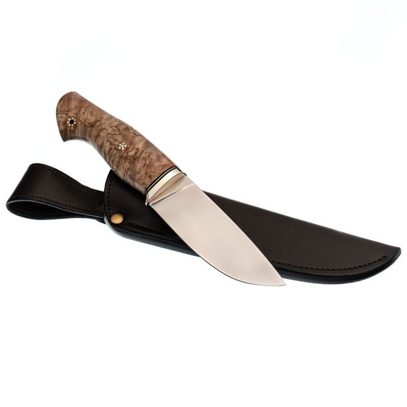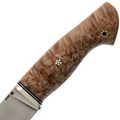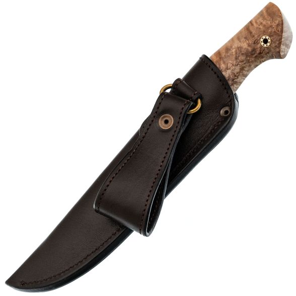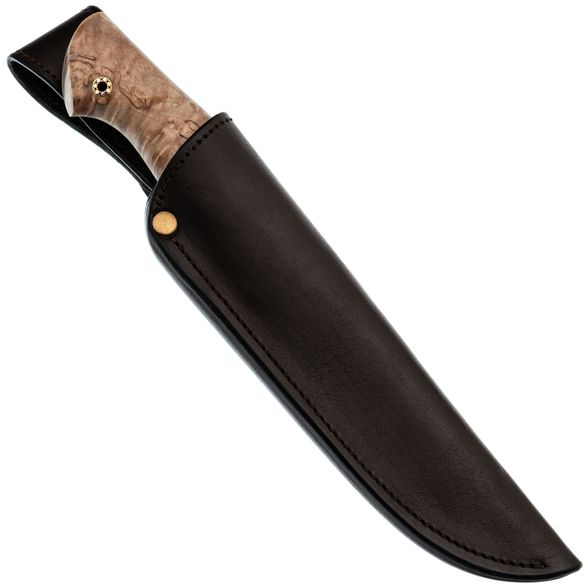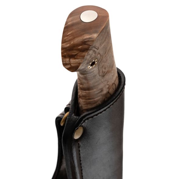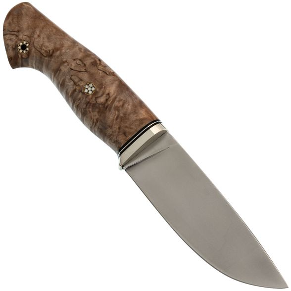 Карельская берёза не только красива, но и функциональна - за счёт уникальной структуры дерево не впитывает влагу и остаётся приятным на ощупь в любую погоду. Эргономичная форма рукояти позволяет крепко держать нож даже при интенсивной работе, а темлячное отверстие с мозаичным пином добавляет удобства и индивидуальности.