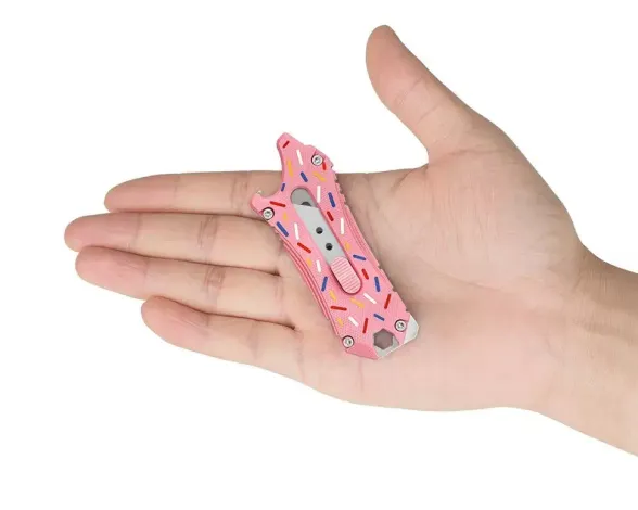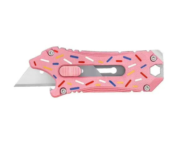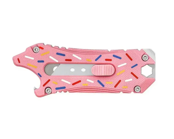 Oknife Otacle Doughnut - Этот очаровательный и компактный канцелярский нож, имеющий несколько инструментов помимо лезвия, которые расширяют его функционал, избавляя вас от необходимости носить с собой лишнее. Его расцветка напоминает глазурь на пончиках, что придает ему яркий и запоминающийся вид. Профиль рукояти выглядит как лев, разинувший пасть, добавляя ему неочевидный милый секрет. В качестве лезвия используются стандартные трапециевидные клинки из любого магазина канцелярских товаров. Приобретите этот уникальный инструмент и он станет вашим верным помощником!