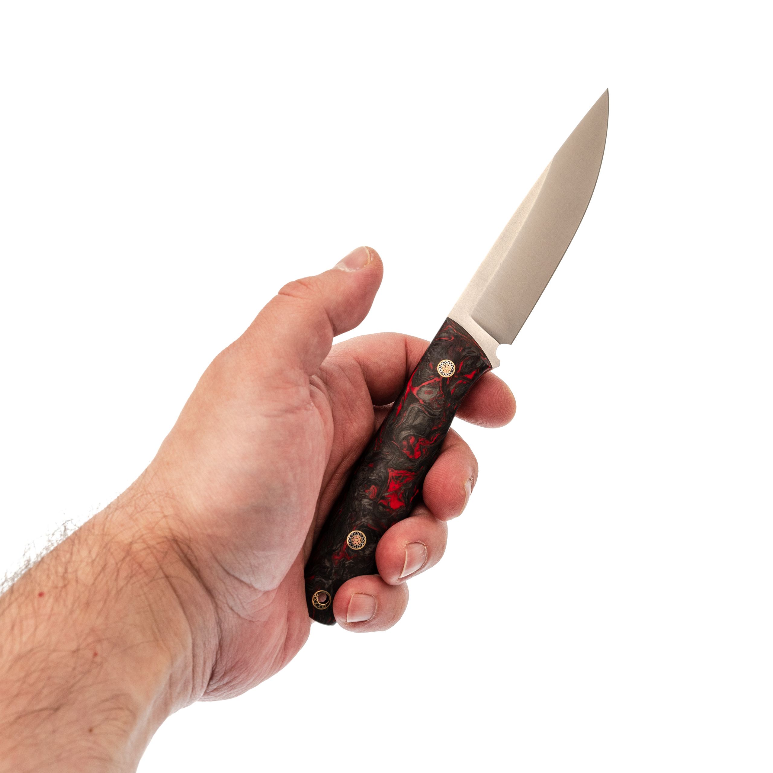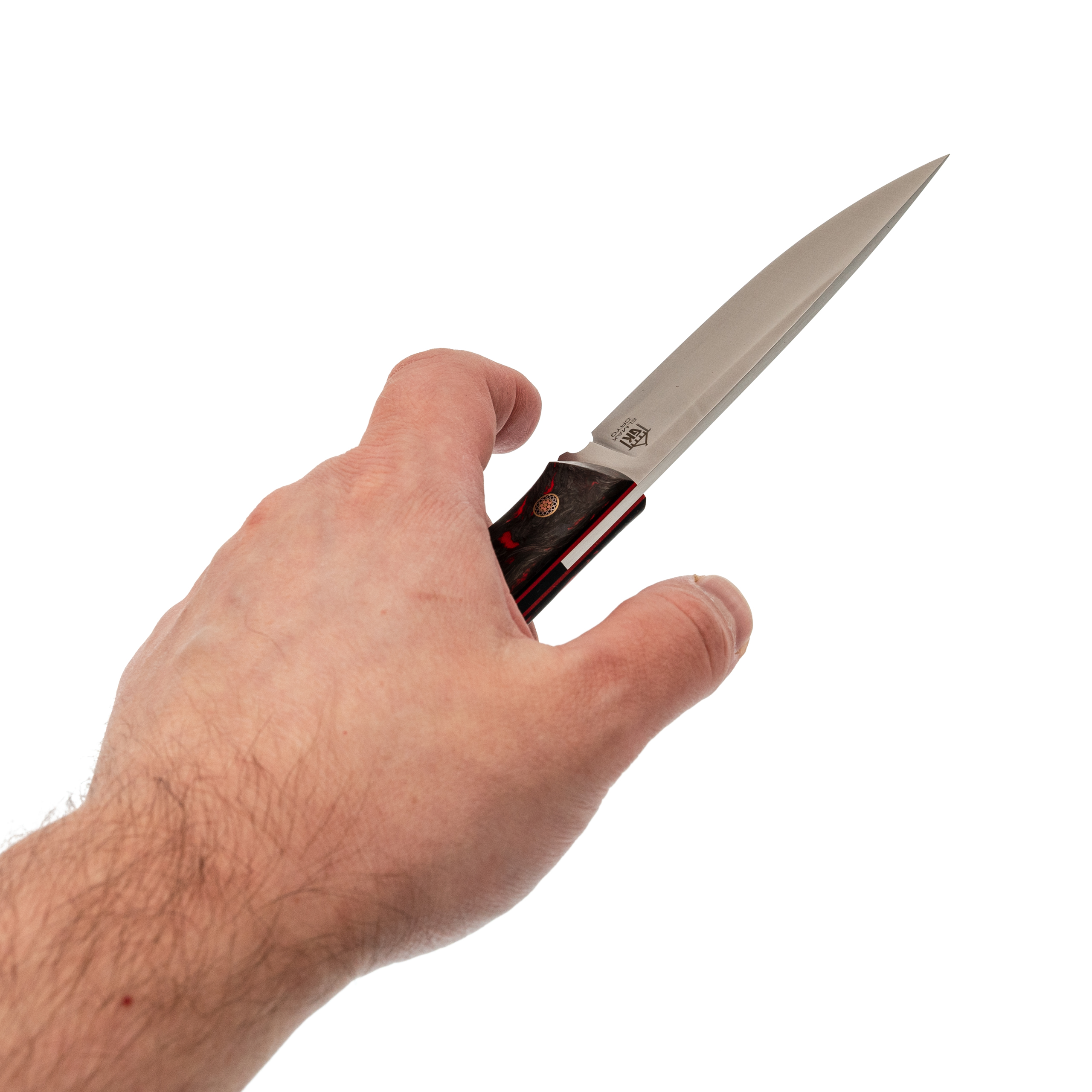 Карбоновая рукоять делает нож особенно приятным по весу и балансу. Она удобно лежит в ладони, хорошо заполняет руку и помогает уверенно контролировать клинок в работе. По ощущению рукоять плотная и собранная, без пустоты и рыхлости, которые иногда встречаются у лёгких моделей. Скрытый цельнометаллический монтаж добавляет надёжности без лишней массивности.
