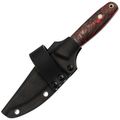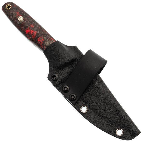 Ножны выполнены из Kydex по схеме тако, поэтому они получились компактными, лёгкими и удобными для постоянного ношения. Нож фиксируется чётко, не гремит и удерживается даже рукоятью вниз. Горизонтальная стропа позволяет удобно носить модель на ремне. Для быстрого извлечения есть выступ под большой палец, а ПВХ-трубка в устье помогает сохранить остроту, исключая контакт клинка со стенками ножен изнутри.