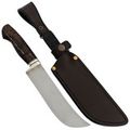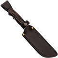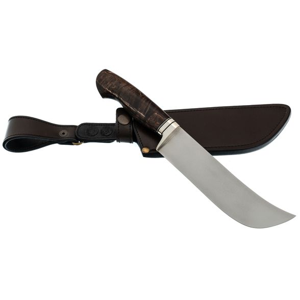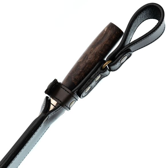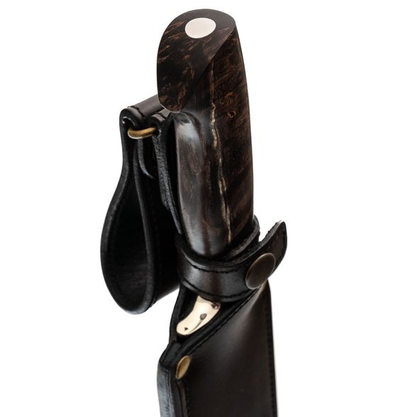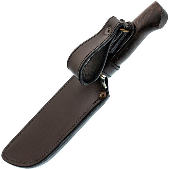 Ножны изготовлены из толстой премиальной натуральной кожи, которая надёжно фиксирует нож в процессе переноски. Дополнительный хлястик обеспечивает фиксацию и предотвращает случайное выпадение ножа. Свободный подвес ножен позволяет использовать изделие в пути без создания неудобств при движении.
