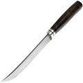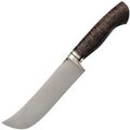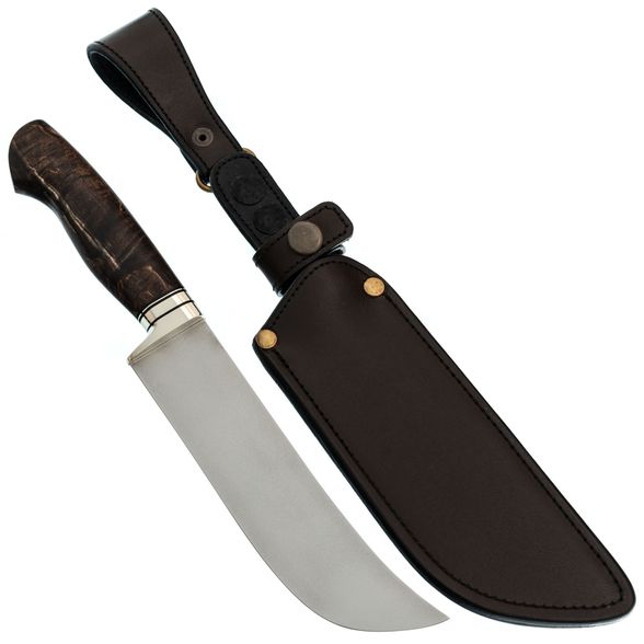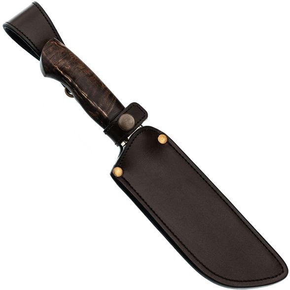 Рукоять выполнена из стабилизированной карельской берёзы, что обеспечивает изделию прочность и неприхотливость в уходе. Натуральная текстура материала сохраняется благодаря использованию качественного стабилизирующего состава. Эргономичная форма рукояти способствует комфортному и безопасному использованию ножа.