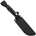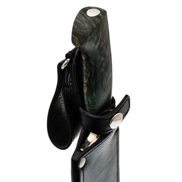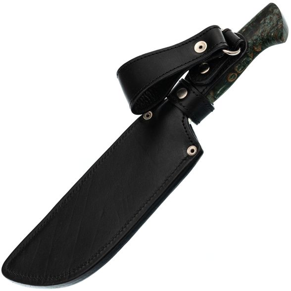 Ножны выполнены из толстой натуральной кожи, что обеспечивает их долговечность и надежное удержание ножа за счёт дополнительного хлястика. Для ношения нож оснащён свободным подвесом, что упрощает его переноску.