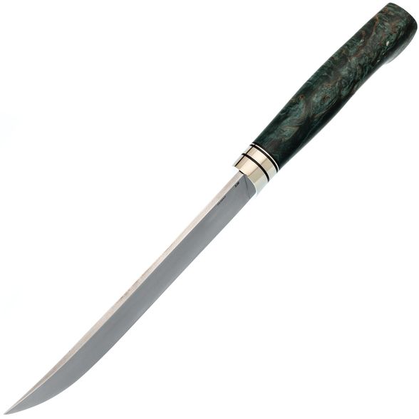 Рукоять изготовлена из стабилизированной карельской берёзы, что обеспечивает её прочность, влагостойкость и аккуратный внешний вид. Эргономичная форма рукояти хорошо заполняет руку, позволяя комфортно работать ножом. Благодаря большой ширине клинка рукоять расположена выше режущей кромки, что повышает удобство работы на поверхности.