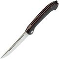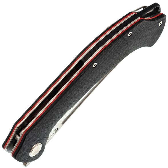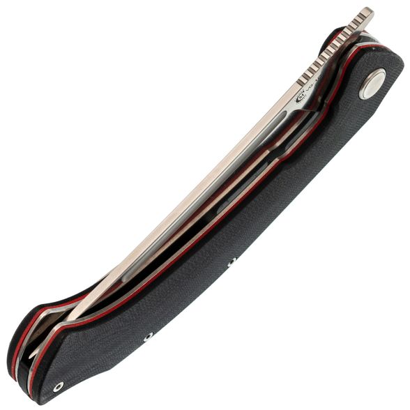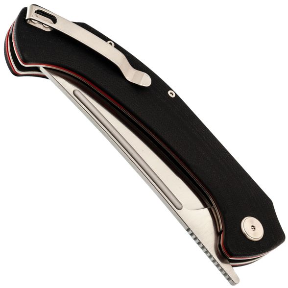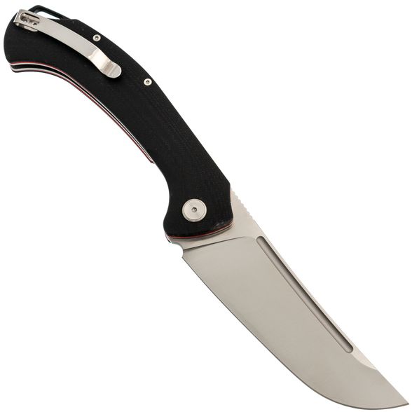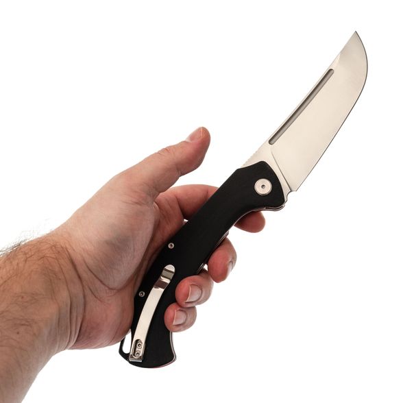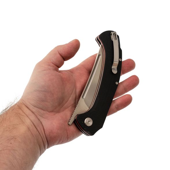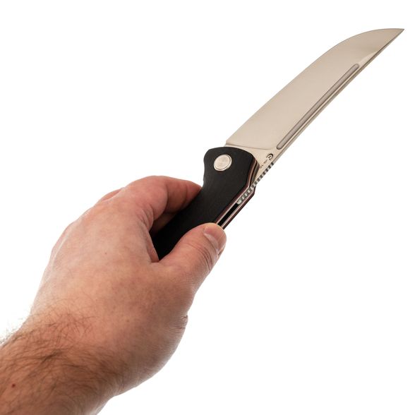 Рукоять имеет удобную изогнутую форму с накладками из стеклотекстолита G10. Этот материал идеален для кухонного ножа: он не боится влаги и не впитывает запахи. На рукояти предусмотрена карманная клипса для удобного ношения. Замок Liner-Lock обеспечивает надёжность фиксации, что вполне достаточно для кухонного или походного использования.