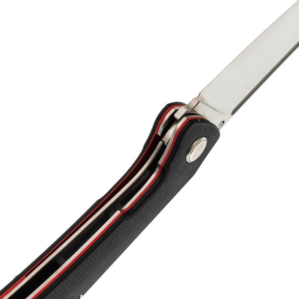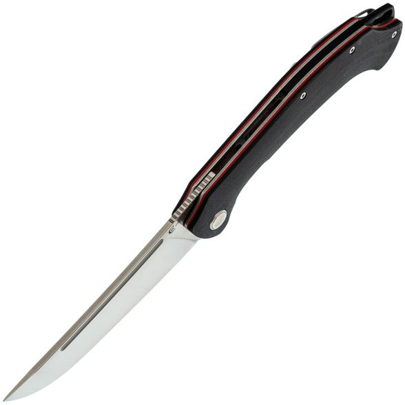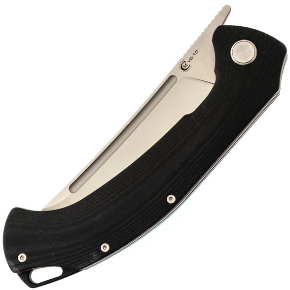 Клинок выполнен из стали VG-10, японской нержавеющей стали, разработанной специально для кухонных ножей. Она долго держит заточку и устойчива к коррозии. Благодаря высоким прямым спускам и широкому клинку нож обладает превосходными режущими характеристиками. Также клинок украшен декоративным долом, который можно использовать для двухручного открытия ножа.
