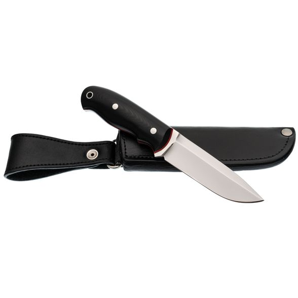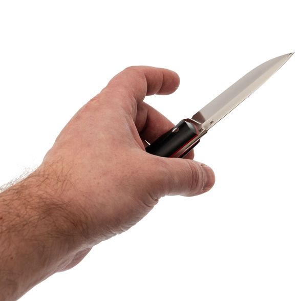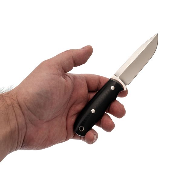 Рукоять выполнена из стеклотекстолита G10 – материала, устойчивого к выцветанию, впитыванию запахов и воздействию влаги, что делает её пригодной для эксплуатации как в городских, так и в походных условиях. Большой объём рукояти в сочетании с небольшими подпальцевыми выемками обеспечивает надёжное и комфортное сцепление с изделием.
