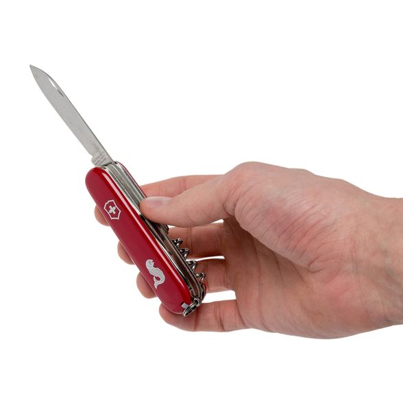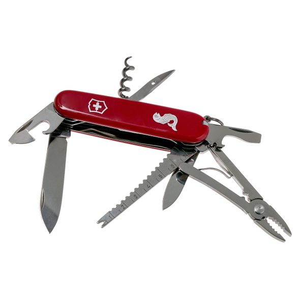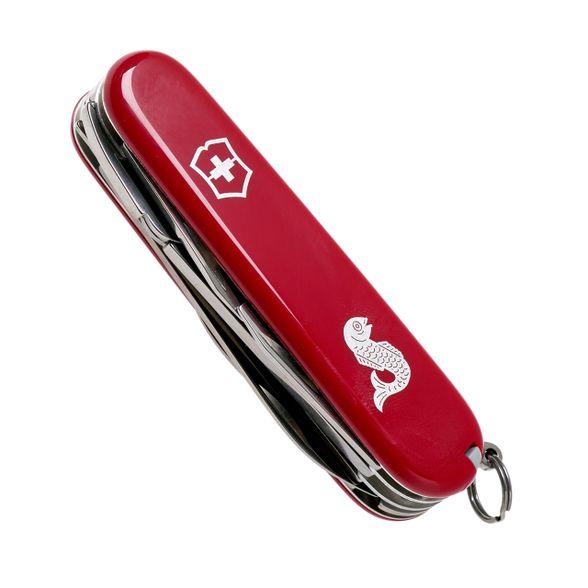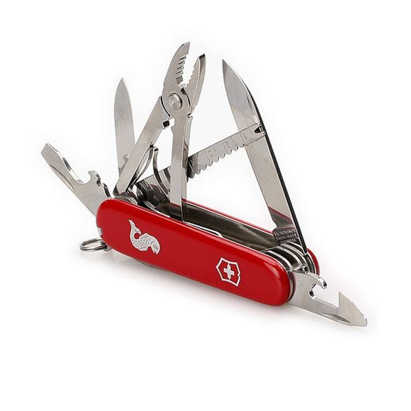 Нож перочинный Victorinox Angler - настоящая находка для всех любителей активного отдыха, ведь в его состав входит целых 19 комплектующих. Среди них имеются большое и малое лезвия, бутылочная открывалка, нож для консервных банок, два вида отверток, штопор, шило, инструмент, снимающий изоляцию, а еще пинцет, кольцо для ключей, зубочистка, плоскогубцы, кусачки и линейка. Помимо этого данная модель оснащена специализированными рыболовными инструментами для чистки рыбы и извлечения крючка. Для всех составляющих использована антикоррозийная сталь X55CrMo14, а для рукояти - органический термопластик Cellidor. Предназначен данный нож Викторинокс для рыбалки, охоты, туризма и других видов активного времяпровождения на природе.