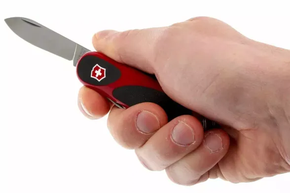 Рукоять EvoGrip заметно отличается от классических гладких накладок Victorinox. За счёт формы и резиновых вставок нож сидит уверенно, не намыливается и не требует постоянного перехвата. Даже при длительной работе рука меньше устаёт, а контроль остаётся точным. Это один из тех случаев, когда удобство ощущается сразу.