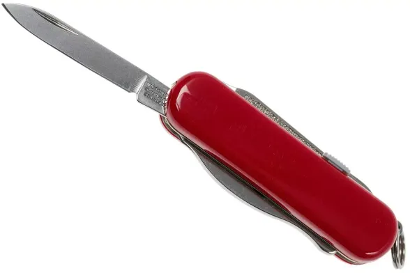 Клинок у Midnite Manager короткий и тонкий, с аккуратной геометрией, привычной для классических швейцарских карманных ножей. Он уверенно справляется с бумагой, скотчем, мягким пластиком и продуктами, когда нужно разрезать упаковку или сделать точный надрез. Сталь держит рабочую остроту, а при затуплении легко восстанавливается на карманной точилке или керамическом мусате.
