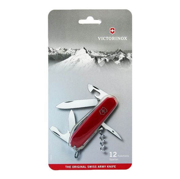 Складной швейцарский нож Victorinox Spartan с красной рукоятью содержит 9 элементов, выполняющих 12 функций: