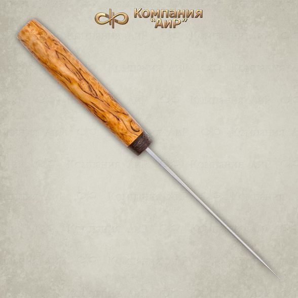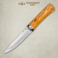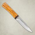 Средний по размерам, универсальный, легкий и прочный нож с клинком, имеющим чуть приспущенный к острию обушок. Вогнутые линзовидные спуски от половины ширины клинка образуют тонкое, изумительно режущее лезвие. Толщина обуха в 2,4 мм позволяет оставить приличную голомень, что придает ему дополнительную прочность. Клинок имеет довольно острый угол острия, что прекрасно подходит для вспарывания брюшка рыбы любой величины, через отверстие движением от себя в сторону нижней челюсти. Эргономичная форма рукояти идеально ложится в любую ладонь. Монтаж клинка сквозной, неразборный. На навершии рукояти имеется отверстие под темляк. Замечательный выбор для любителей рыбной ловли.
