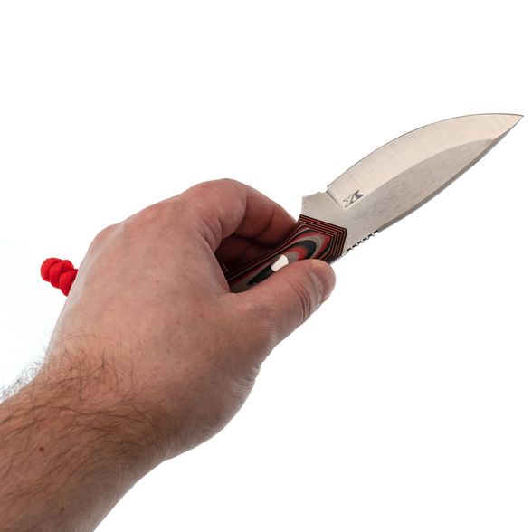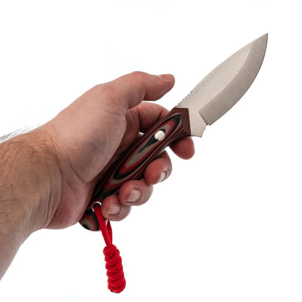 Клинок изготовлен из стали D2, классической инструментальной стали, которая отличается высокой прочностью и удержанием остроты. Кроме того, она обладает лучшей стойкостью к коррозии, чем большинство инструментальных сталей, что делает её более неприхотливой в уходе. Прямые спуски, расположенные выше середины, и форма Drop-Point обеспечивают ножу универсальность, а широкая голомень делает процесс заточки комфортным.
