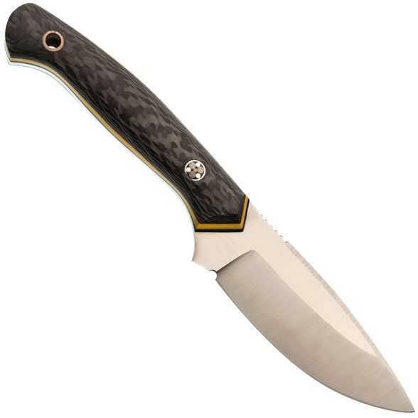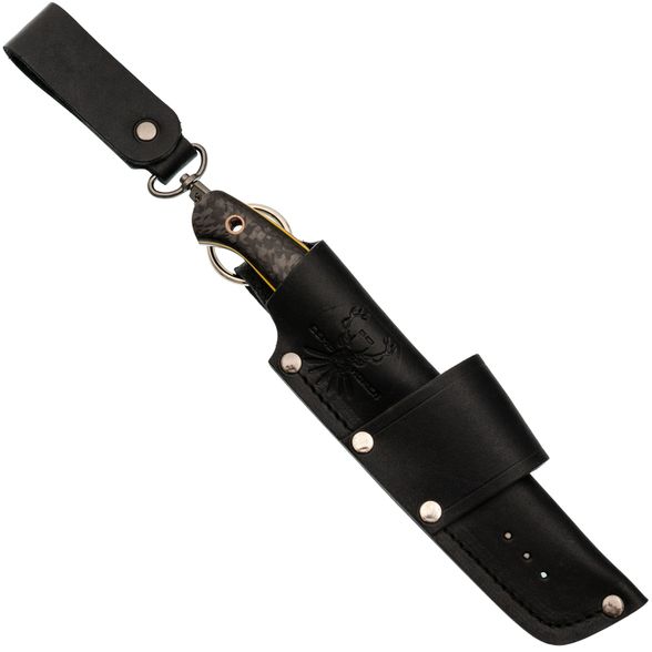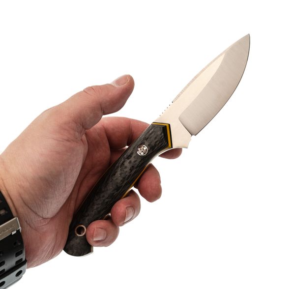 Рукоять ножа "Пиранья" имеет удобную изогнутую форму, которая идеально заполняет ладонь. Она обеспечивает комфорт и уверенное хранение даже при длительном использовании. Рукоять монтируется на полный хвостовик с накладками из ламината G10 с добавлением карбона. G10 обеспечивает прочность и стабильность, в то время как карбон придает рукояти легкость и создает привлекательный внешний вид. Изогнутая форма рукояти обеспечивает идеальное положение пальцев, позволяя применять нож с различными техниками захвата.