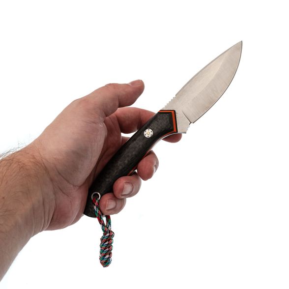 Рукоять сочетает G10 и карбон, что добавляет эстетическую привлекательность благодаря хаотичной текстуре карбона. Материалы обеспечивают прочность, лёгкость и устойчивость к воздействию окружающей среды. Удлинённая форма рукояти позволяет использовать различные хваты, а объёмные накладки надёжно заполняют руку. Накладной монтаж повышает долговечность конструкции.
