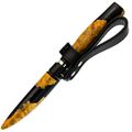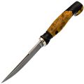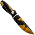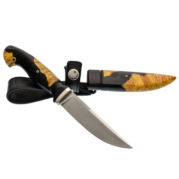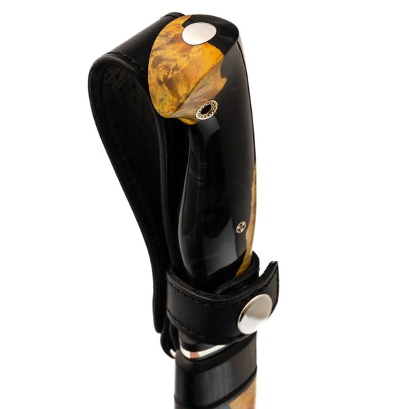 - Рукоять: стабилизированный кап клёна и акрил. Кап клёна сам по себе имеет потрясающую текстуру, а под давлением с пропиткой смолами он становится твёрдым, тяжёлым и очень приятным на ощупь материалом. Акриловые вставки добавляют игру света и глубины, делая рукоять нарядной, но не скользкой.