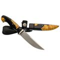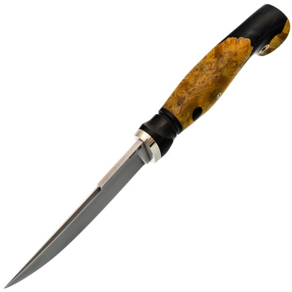 Этот экземпляр от мастерской Ульданова - яркий пример того, как рабочий инструмент может выглядеть стильно и дорого. Перед нами фиксированный нож средних размеров, который создан не для коллекционной полки, а для настоящей жизни. Он одинаково уверенно чувствует себя на кухне при нарезке продуктов, в походе при подготовке хвороста или строгании щепы, и просто в руке, когда нужно что-то быстро отрезать или открыть. В нём есть этакая хищная, дерзкая эстетика, но она идёт ему только на пользу, не превращая нож в бесполезную безделушку.