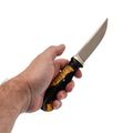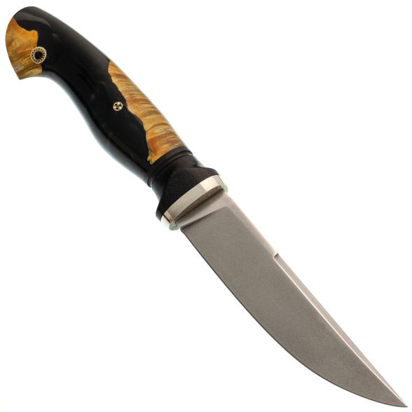 То, как сделана рукоять, вызывает уважение. Здесь использован сквозной монтаж - хвостовик клинка проходит через все слои материала и фиксируется с торца. Мастерская Ульданова известна своей педантичностью в этом вопросе: всё подогнано идеально, никаких щелей и люфтов. Форма рукояти анатомичная, она хорошо заполняет ладонь. Даже если работать долго и в перчатках, рука не устанет и не натрет мозолей. Надёжность такой конструкции максимальная: нож не разболтается, даже если рубить или использовать его как рычаг.