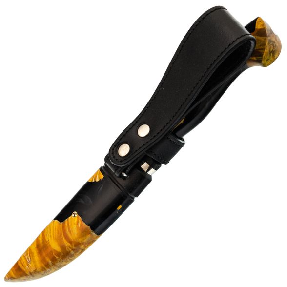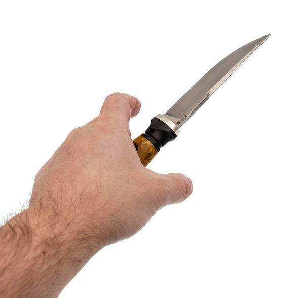 Ножны выполнены по классическим канонам финских ножей - из дерева. Они точно повторяют форму клинка и удерживают его трением, так что нож не выпадет сам по себе, даже если вы наклонитесь вниз головой. Для подстраховки есть кожаный хлястик, который фиксирует рукоять. Носить нож удобно на свободной подвеске - он болтается на ремне или рюкзаке, не цепляется за ветки и не мешает при ходьбе, а когда нужно, легко вынимается.