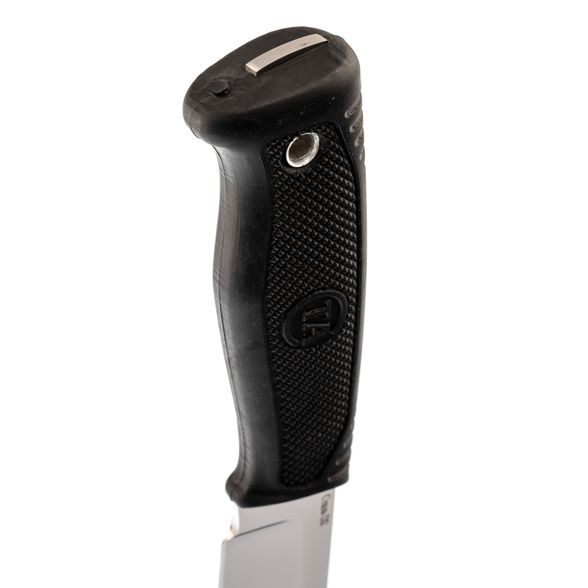Рукоять ножа выполнена из резины, которая не боится воды и обеспечивает надежный хват даже в влажных условиях. Резина поглощает часть вибрации от нагрузок, делая работу с ножом еще более комфортной. Цепкий текстурированный рисунок предотвращает скольжение, а темлячное отверстие позволяет дополнительно закрепить нож на руке за счет темляка.